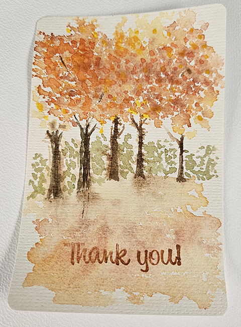 Een warm en sfeervol handgeschilderd bedankkaartje met een los geschilderd bos in schitterende herfstkleuren. De aquarel toont een spel van oranje, goudgeel en zachtgroene tinten, als een wandeling door een zonnig herfstbos. In het water aan de voet van de bomen weerspiegelt zich subtiel de tekst Thank You, als een poëtisch gebaar van dankbaarheid.