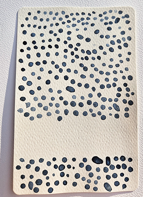 Een spel van water en pigment? alsof regendruppels hun eigen verhaal vertelden op het papier. Deze bijzondere handgeschilderde kaart bestaat uit tientallen waterdruppels die subtiel een infusie van blauwe aquarelverf ontvingen. Het resultaat is een abstract patroon dat doet denken aan regensporen op steen, sterrenstof, of het ritme van ademhaling.