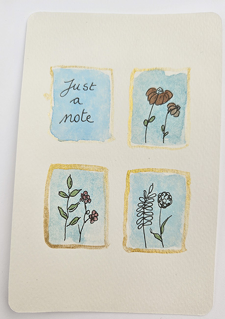 Breng een glimlach op iemands gezicht met deze unieke, handgeschilderde wenskaart! Deze kaart bestaat uit 4 kleine botanische illustraties, elk omlijst met een subtiele lijntekening en een rijke blauw-aquarel achtergrond. De fijne metallic goudverfdetails geven een warme, sprankelende touch – perfect voor elke gelegenheid.