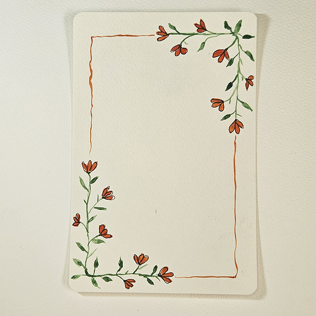 Breng een warme en persoonlijke touch aan je bericht met deze handgemaakte aquarelkaart. De kaart is met fijne penseelstreken versierd met oranje bloemetjes en groene blaadjes, die speels vanuit drie hoeken naar binnen groeien. Een subtiel golvende kader in bijpassend rood omlijst het geheel en geeft de kaart een charmant en ambachtelijk karakter.