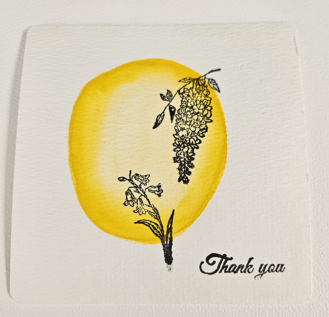 Een stijlvolle handgeschilderde thank you-kaart die warmte en eenvoud uitstraalt. Het zachte gele aquarelvlak vormt een zonnige achtergrond voor twee fijne bloemenillustraties in zwarte inkt, een harmonie tussen licht, elegantie en dankbaarheid.
