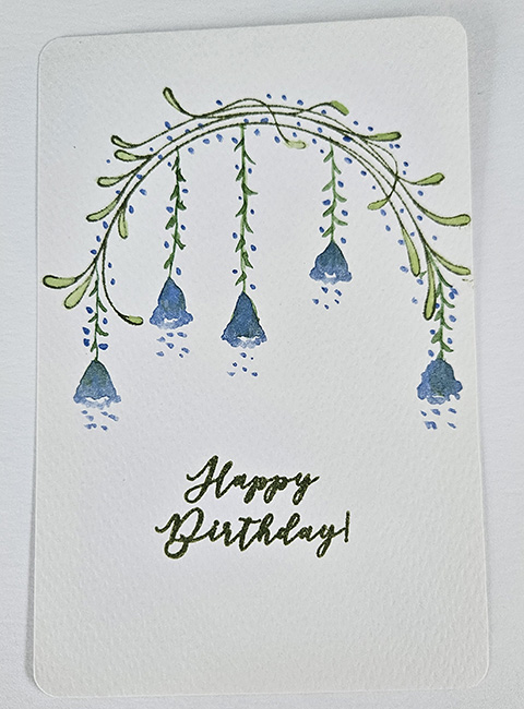 Deze charmante mixed media verjaardagskaart is een ode aan eenvoud, elegantie en natuurlijke schoonheid. Op een wit, licht gestructureerd kaartpapier met afgeronde hoeken siert een sierlijke boog van groene ranken de bovenkant van het ontwerp. De boog is rijkelijk versierd met kleine blaadjes en hangende blauwe klokvormige bloemen, die een frisse en feestelijke uitstraling geven. Rondom de bloemen zijn subtiele blauwe stipjes aangebracht, wat het geheel een speels en luchtig karakter verleent. Onder deze florale compositie staat de handgeschreven boodschap “Happy Birthday!” in een sierlijk donkergroen cursief lettertype, wat perfect aansluit bij de natuurlijke kleuren en het ambachtelijke karakter van de kaart.