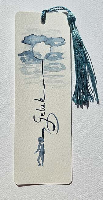 Een dromerige handgemaakte boekenlegger in aquarel en inkt. Het woord Geluk vloeit sierlijk over in de afbeelding van een kindfiguurtje dat zich optrekt aan de lijn, terwijl bovenaan wolken zacht in blauw aquarel zweven. De fijne kwaststreken en speelse compositie maken van deze boekenlegger een klein kunstwerkje.