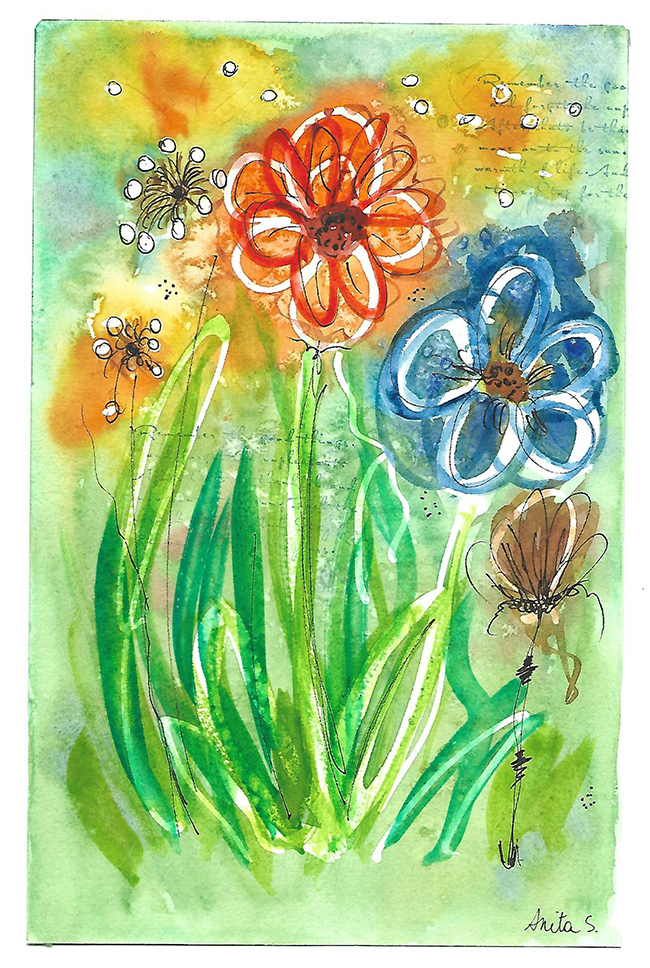 Kleurrijke, speelse aquarel van 15 x 23 cm met een frisse bloemenpracht. Warme oranje- en koele blauwtinten vloeien moeiteloos samen met helder groen en subtiele inktlijnen. De losse penseelstreken en fijne details geven de bloemen een vrolijke, kunstige uitstraling, een unieke blikvanger voor interieur of als origineel geschenk.