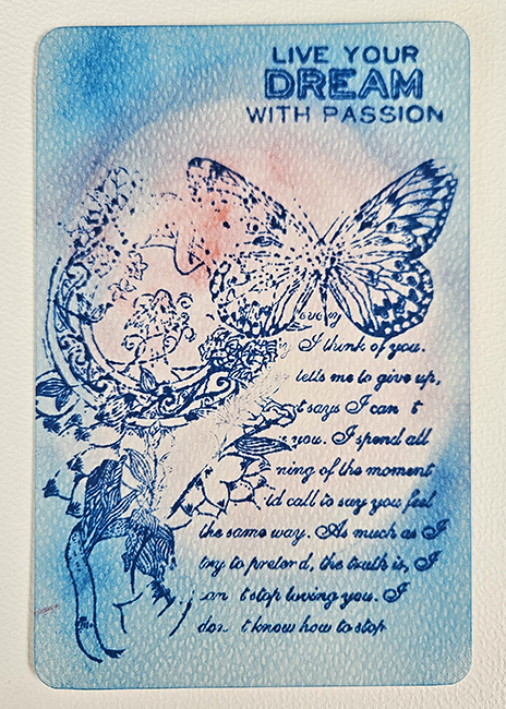 De sierlijke vlinder en florale details zijn vervaardigd met fijne stempeltechniek, waarbij de blauwe inkt elegant contrasteert tegen de pastelachtergrond. De inspirerende tekst “Live your dream with passion” maakt deze kaart perfect om iemand te motiveren, te bemoedigen of simpelweg een glimlach te brengen.