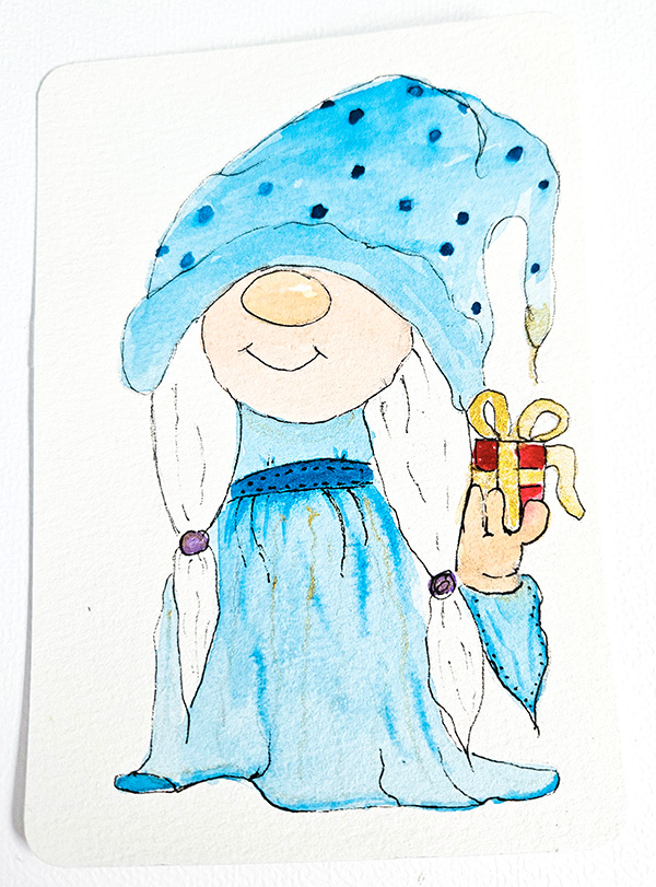 Deze vrolijke dwergdame straalt pure feestvreugde uit. Met haar lange witte vlechten, speels blauwe jurk en bijpassende stippenmuts houdt ze een klein rood cadeautje met gouden strik omhoog, klaar om iemand blij te maken.