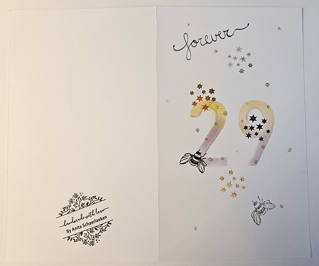 De kaart is met liefde handgemaakt en straalt een positieve, feestelijke energie uit. Ideaal voor een verjaardag met een knipoog, een vriendin die 29 blijft vieren, of gewoon als originele felicitatie. De linkerkant van de kaart bevat een elegant label met "handmade with love by Anita Schaerlaeken", wat het ambachtelijke karakter benadrukt.