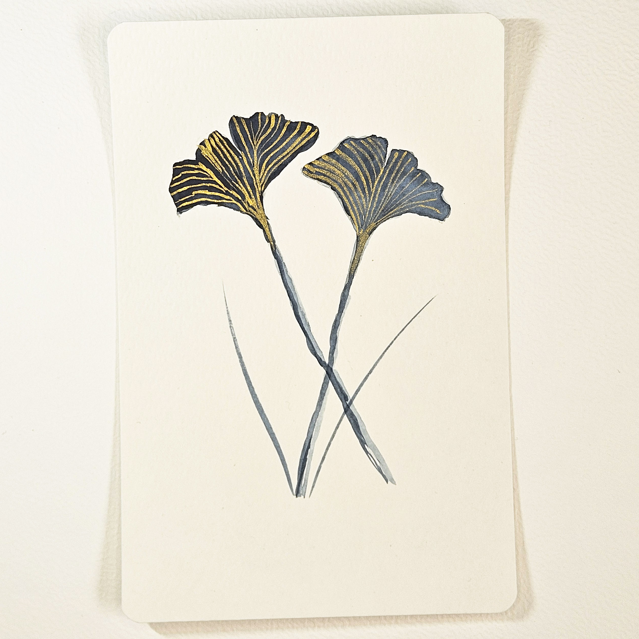 Deze kaart vangt deze bijzondere bladervorm in een verfijnde aquarelcompositie, waar zachte indigo tinten worden aangevuld met subtiele gouden accenten die licht vangen en schitteren bij elke beweging.