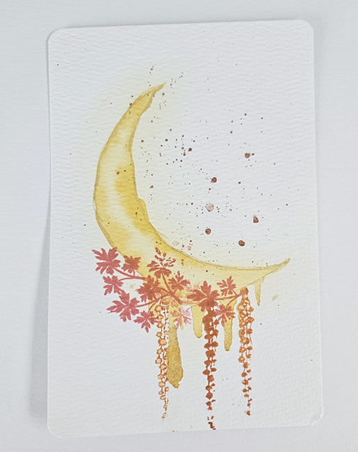 Deze unieke mixed media kaart straalt een dromerige en poëtische sfeer uit. Op een handgemaakt, wit kaartpapier met subtiele textuur schittert een halve maan in warme tinten geel en goud. De maan lijkt zachtjes te smelten, met een sierlijk druipend effect dat haar een magisch en surrealistisch karakter geeft. Rond de onderzijde van de maan bloeien levendige bloemen in rood- en oranjetinten, omlijst door sierlijke hangende ranken die een botanische charme toevoegen.