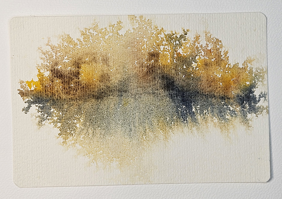 Dit schilderij vangt de warme, mysterieuze sfeer van de herfst in een abstract aquarel. Met zachte bruintinten, gouden accenten en diepe grijstinten vloeien de kleuren in elkaar over als een spel van licht, schaduw en weerspiegeling. De organische vormen doen denken aan een bosrand of bomen die spiegelen in stil water, terwijl de abstractie ruimte laat voor eigen interpretatie. Een kunstwerk dat rust, diepte en de magie van het seizoen uitstraalt.
