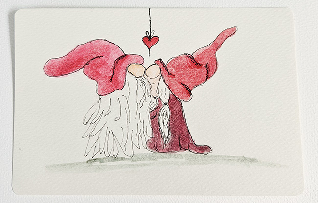 Twee verliefde kabouters vinden elkaar onder een bungelend rood hartje. Hun lange mutsen raken elkaar speels terwijl hun neusjes zachtjes samenkomen, een teder moment vol warmte en genegenheid.