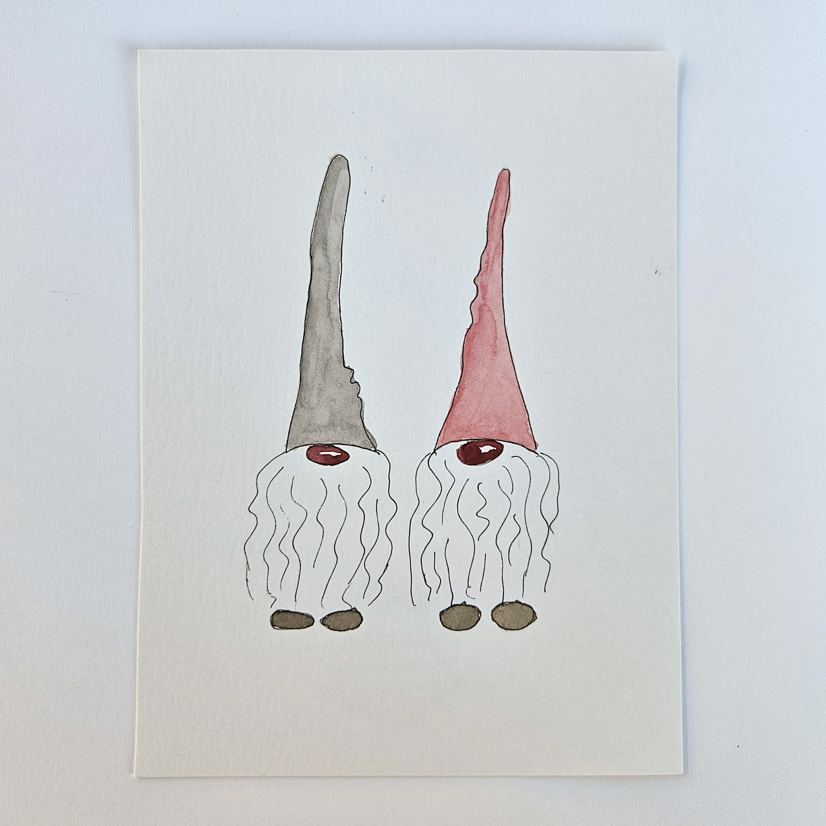 Deze handgeschilderde aquarelkaart met twee gezellige kerstgnomes brengt een vleugje humor én hartverwarmende eenvoud in je kerstgroet.