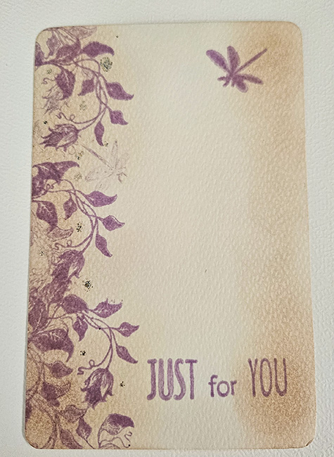 Een elegante handgemaakte kaart met een zachte, natuurlijke uitstraling. Langs de linkerzijde slingert een sierlijk bloemenmotief in paars, subtiel aangevuld met fijne glitteraccenten die het licht prachtig vangen. Bovenaan zweeft een gracieuze libel, en onderaan staat de warme boodschap “Just for You”.