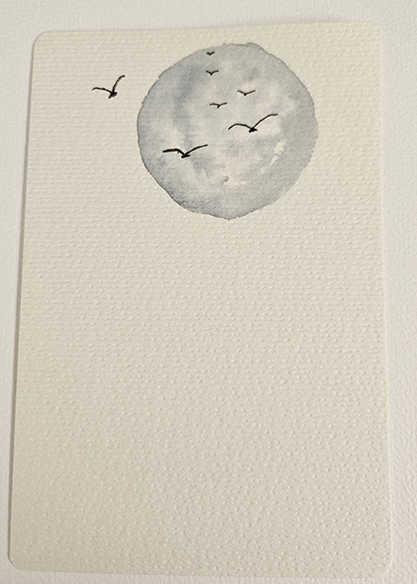 Een minimalistische aquarel die rust ademt. In zachte grijstinten toont deze handgeschilderde kaart een ronde hemelcirkel waarin een zwerm vogels vrij rondzweeft. De subtiele penseelstreken en de rustige compositie creëren een gevoel van stilte, vrijheid en oneindigheid.