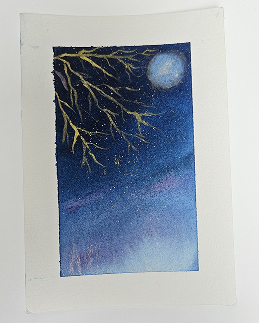 Een dromerige aquarel waarin de nacht tot leven komt. Onder het zachte licht van de volle maan schitteren fijne gouden takken tegen een diepe nachtblauwe hemel. Kleine glinsteringen doen denken aan sterrenstof dat langzaam neerdaalt, een moment van rust en verwondering gevangen op papier.