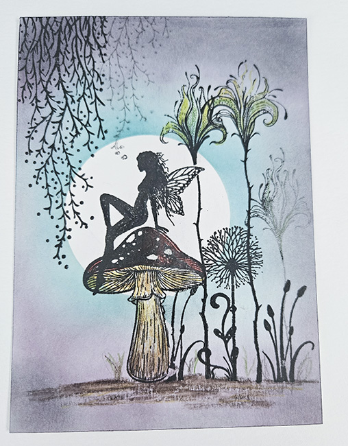 Deze handgemaakte fantasiekaart voert je meteen mee naar een magische avond in het bos. In het midden zit een elegante silhouet-fee rustig dromend bovenop een grote roodbruine paddenstoel. Haar fijne vleugels en speels geblazen belletjes geven de scène een zachte, dromerige sfeer.