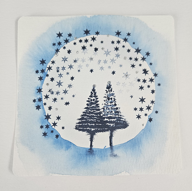 Deze betoverende mixed media kaart vangt de magie van de natuur en het universum in één harmonieus kunstwerk. Op een vierkant vel met afgeronde hoeken staan twee sierlijke dennenbomen centraal, geschilderd in zachte aquareltonen die rust en sereniteit uitstralen. Rondom de bomen ontvouwt zich een cirkel vol zwarte sterren in diverse groottes, alsof ze dansen in een kosmische werveling. Deze sterrenhemel wordt omlijst door een subtiele blauwe aquarelwash die naar buiten toe vervaagt, wat een dromerig en lichtgevend effect creëert. De combinatie van natuurlijke elementen en hemelse symboliek maakt deze kaart perfect voor spirituele gelegenheden, rustgevende geschenken of als decoratief kunstwerk. Handgemaakt met oog voor detail en emotie, straalt deze kaart een gevoel van verwondering en innerlijke vrede uit. Ideaal voor liefhebbers van minimalistische kunst, natuurthema’s en mystieke sferen.