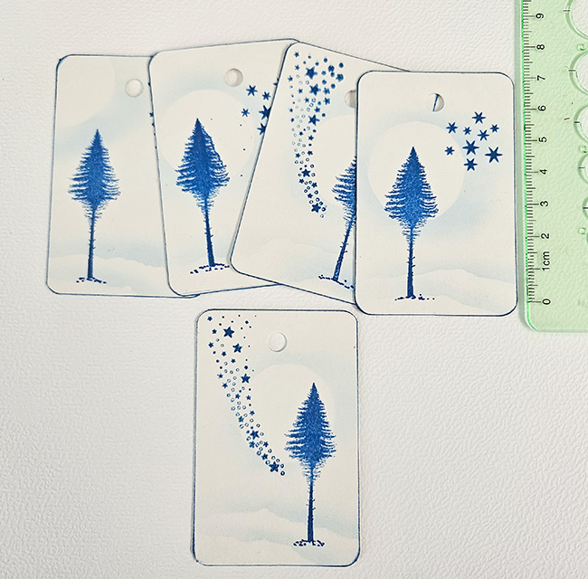 Minimalistische kerstlabels met blauwe boom en maan