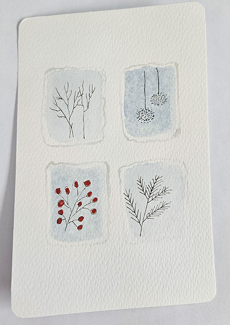 Deze handgeschilderde aquarelkaart straalt eenvoud en rust uit. Vier kleine winterse taferelen – fijne takjes, bessen, dennengroen en twee hangende sneeuwballen, zijn met de hand geschilderd op een zachte blauwgrijze achtergrond. Het subtiele randje in zilver glitter aquarelverf geeft de kaart een feestelijke en verfijnde toets.