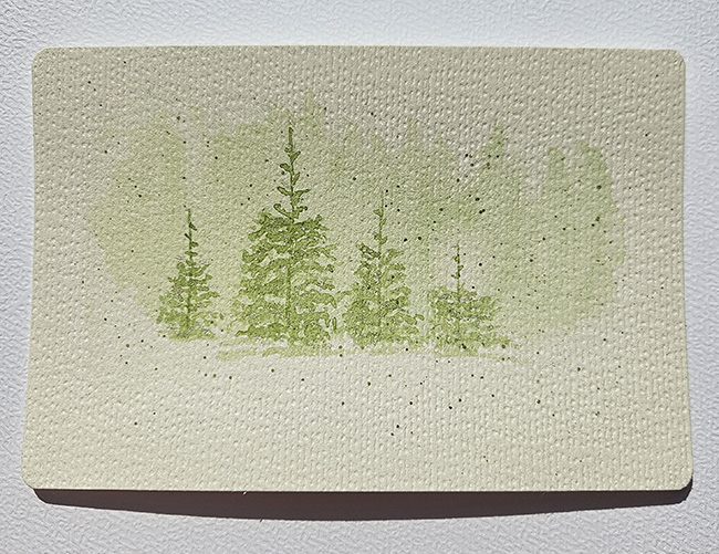 Een sfeervolle handgemaakte kerstkaart met een aquarelillustratie van een mysterieus, mistig dennenbos in zachte groentinten. Fijne groene en metallic verfspatten zorgen voor een sprankelend glittereffect dat het winterse landschap een feestelijke uitstraling geeft. Deze unieke kaart straalt rust, magie en warmte uit, perfect om jouw kerstgroeten op een bijzondere manier te versturen.