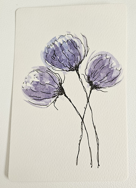 Een ode aan eenvoud en verstilling. Deze handgeschilderde kaart toont drie elegante bloemen in zachte paarse aquareltonen, verfijnd aangezet met losse zwarte lijnen. De bloemen lijken te zweven in een moment van stilte, elk met een eigen ritme en sierlijke buiging. De compositie ademt rust, ruimte en een tikkeltje melancholie.