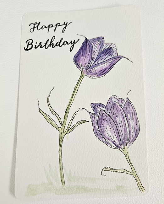 Een elegante handgeschilderde verjaardagskaart met twee verfijnde paarse bloemen, liefdevol uitgewerkt in aquarel en inkt. De zachte kleurovergangen en fijne lijnen brengen de bloemen tot leven op het gestructureerde papier, terwijl de eenvoudige Happy Birthday-tekst het geheel een tijdloze charme geeft.