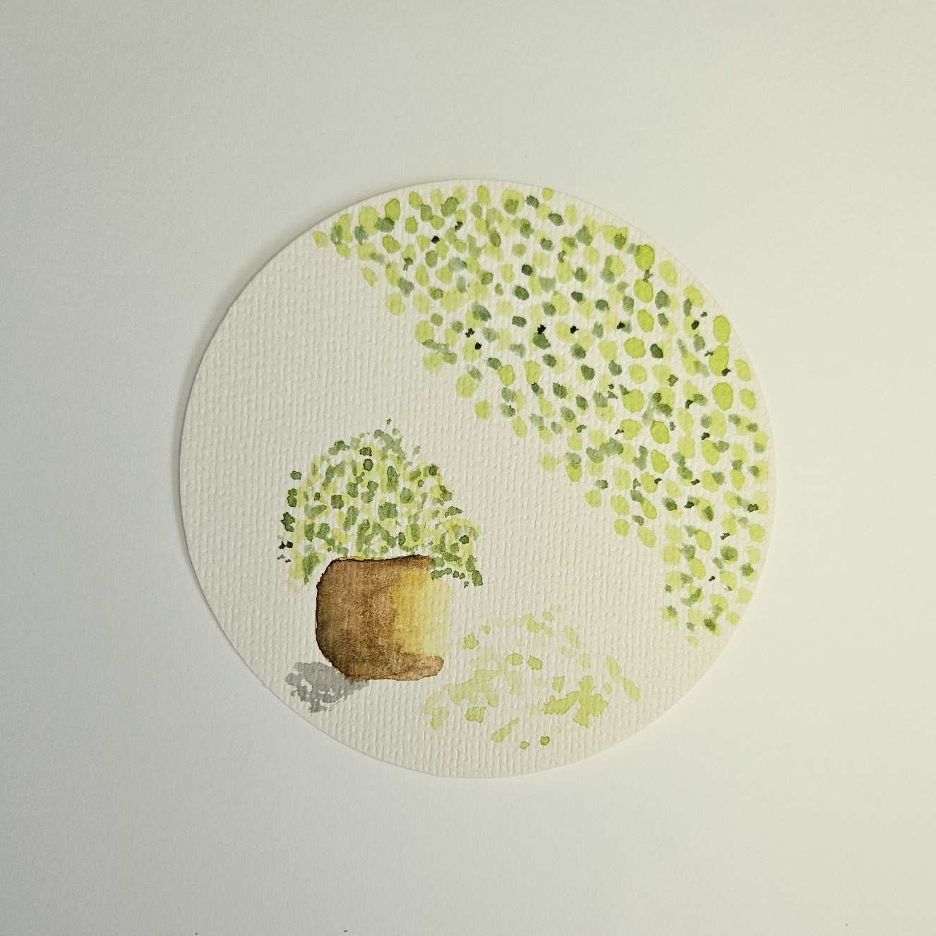 Unieke handgeschilderde ronde kaart met bloempot op aquarelpapier.