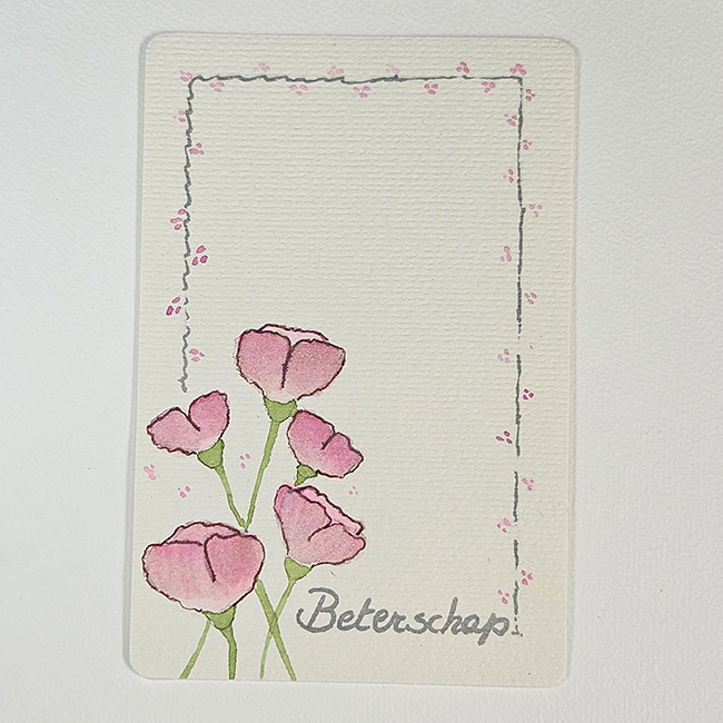 Breng een warme en persoonlijke touch aan je bericht met deze handgemaakte aquarelkaart. De kaart is met fijne penseelstreken versierd met roze bloemen. Een subtiel golvende kader in bijpassend roze en grijs omlijst het geheel en geeft de kaart een charmant en ambachtelijk karakter.