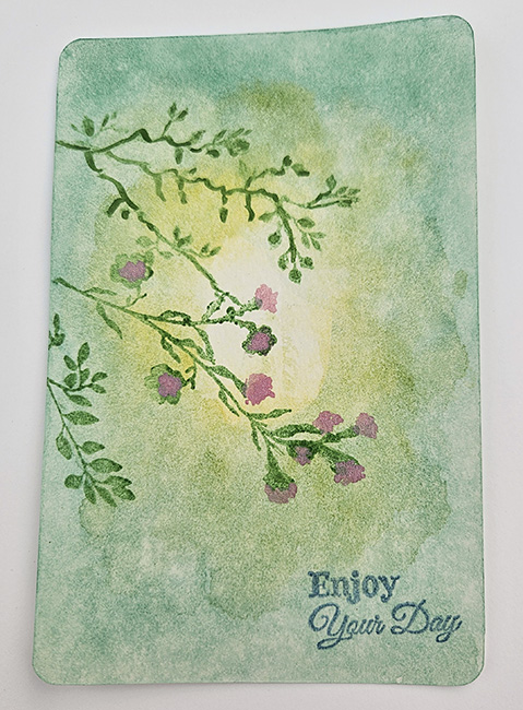 De ene kaart toont sierlijke bloesemtakjes met subtiele paarse accenten en de tekst “Enjoy Your Day”, terwijl de andere kaart een zomers veld van eenvoudige bloemen in pastelkleuren weergeeft.