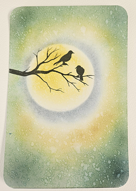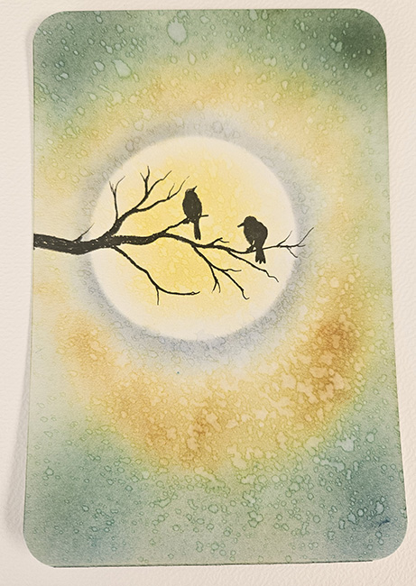 Een dromerige set van twee handgemaakte kaarten met een sfeervol tafereel van twee vogels op een tak, badend in zacht maanlicht. De achtergrond vloeit van diep groen naar warm goudgeel en vangt het spel van licht en schaduw in een serene nacht.