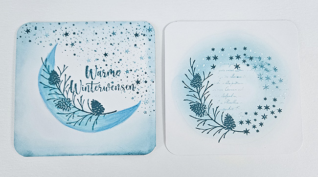 Kaart 1 : Deze handgemaakte winterkaart straalt een zachte, verstilde sfeer uit dankzij de combinatie van aquarel, stempels en subtiel blendingwerk. In het midden schittert een elegant gebogen maanvorm, opgebouwd in koude wintertinten blauw en turquoise. Langs de maan loopt een gestempelde winterse dennenrank met naalden en dennenappels in fijne, gedetailleerde lijnen.