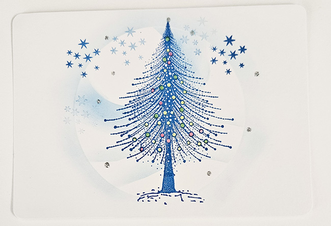Kaart 1: Een gestileerde blauwe kerstboom siert het midden van de kaart, versierd met witte en blauwe stippen die doen denken aan lichtjes of ornamenten. De achtergrond is opgebouwd uit zachte blauwe cirkels en sneeuwvlokken, met subtiele zilveren accenten die een sprankelend effect geven.