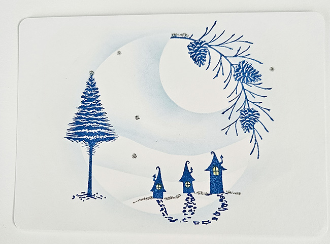 Kaart 2: Een serene winterlandschap toont een slanke blauwe boom aan de linkerzijde en drie knusse huisjes met warmgele ramen aan de rechterkant. Bovenaan hangen dennentakken met dennenappels, omlijst door een zachte blauwe gloed en zilveren details die het geheel een magische uitstraling geven.