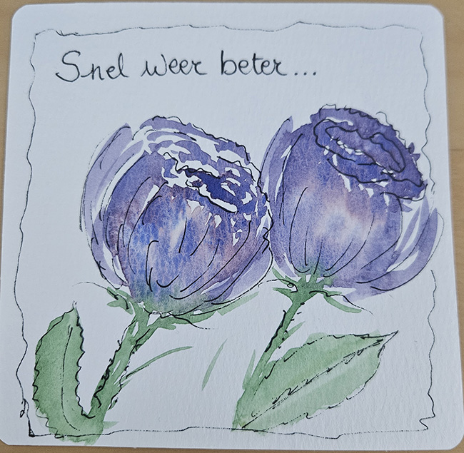 Een elegante handgeschilderde verjaardagskaart met twee verfijnde paarse bloemen, liefdevol uitgewerkt in aquarel en inkt. De zachte kleurovergangen en fijne lijnen brengen de bloemen tot leven op het gestructureerde papier, terwijl de eenvoudige Snel weer beter-tekst het geheel een tijdloze charme geeft.