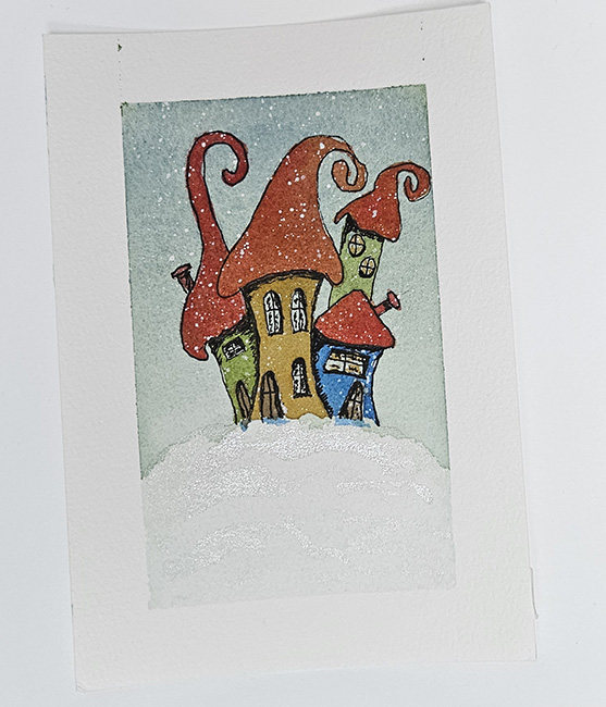 Stap binnen in een betoverend winterdorp met deze handgeschilderde aquarel vol kleur en fantasie. Drie speelse huisjes met zwierige rode daken lijken zo uit een sprookje te komen. Hun ramen fonkelen warm in het zachte winterlicht terwijl fijne sneeuwvlokken neerdwarrelen op een witte deken van sneeuw.