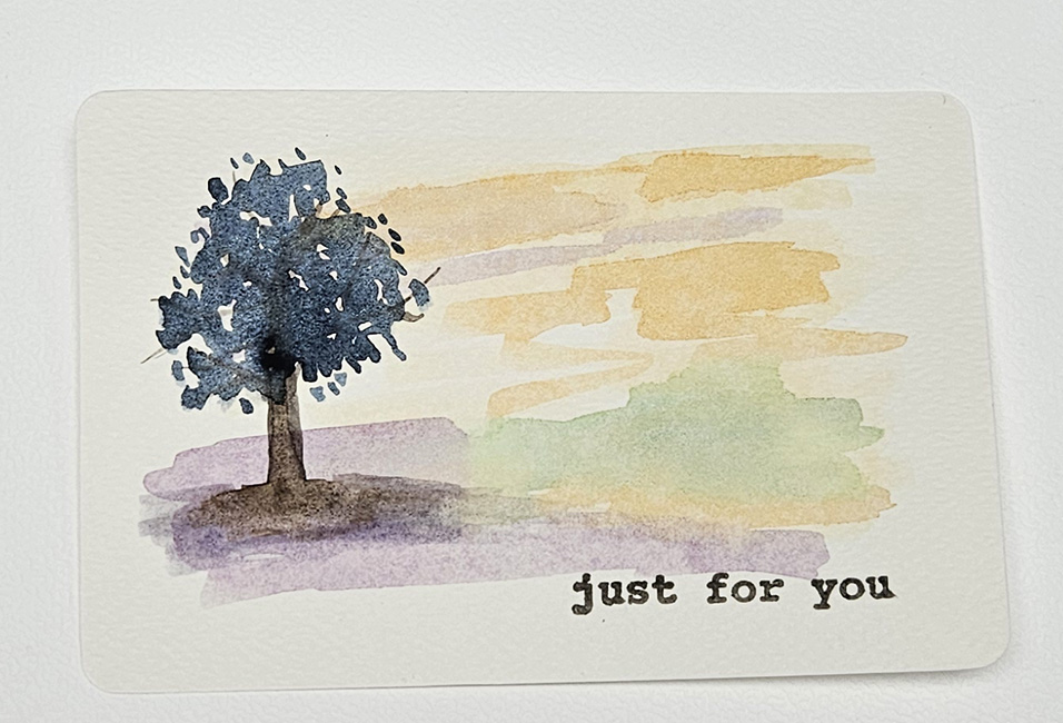 Een sfeervolle handgemaakte wenskaart met een aquarelillustratie van een diepblauwe boom tegen een achtergrond van zachte pastelkleuren in oranje, groen en paars. Onderaan staat de boodschap “just for you”, waardoor deze kaart geschikt is voor allerlei gelegenheden: om iemand te verrassen, te bedanken of gewoon een warm gebaar te maken.