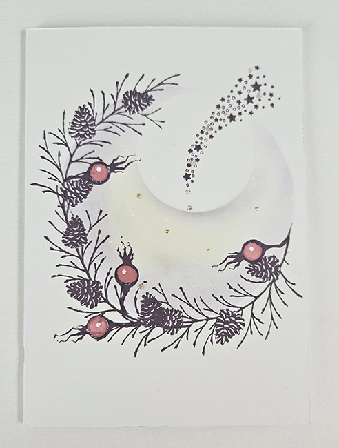 De kaart toont een zacht opgelichte wintermaan, omringd door elegante dennentakken en kleine dennenappels. Tussen het groen verschijnen rode, met de hand ingekleurde besjes die de kaart een feestelijke toets geven. Bovenaan dwarrelt een sierlijke sterrenregen naar beneden, gestempeld in diep zwart en aangevuld met minieme gouden glitteraccenten die subtiel fonkelen wanneer het licht erop valt.
