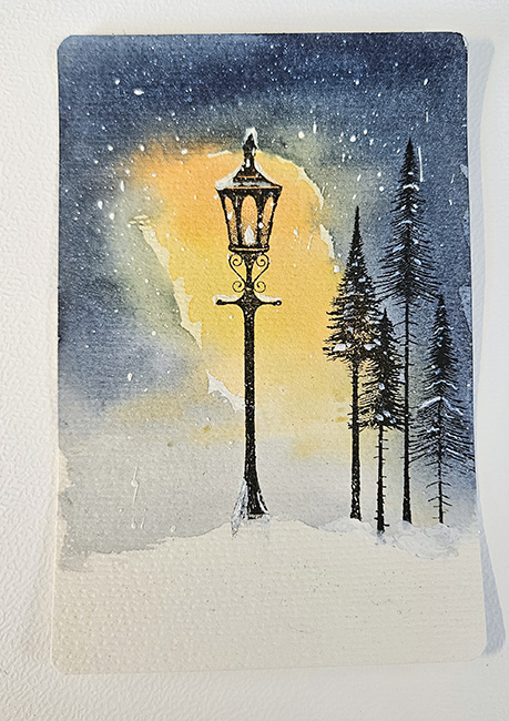Deze handgeschilderde winterkaart toont een sfeervolle sneeuwscène met een sierlijke lantaarnpaal die zacht licht uitstraalt. Het warme geel-oranje licht van de lamp vloeit prachtig over in een nachtelijke lucht in diepe blauwtinten. Naast de lantaarn staan hoge, slanke dennenbomen, waardoor een gevoel van stilte en diepte ontstaat, alsof je je in een rustige winterse boslaan bevindt.