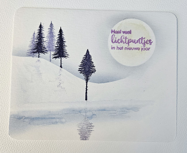 Deze handgemaakte mixed media kaart straalt rust, hoop en verfijning uit. Een sereen winterlandschap met besneeuwde heuvels en statige dennen weerspiegelt in een stil, deels bevroren wateroppervlak. De zachte, gedempte kleuren geven een kalme en contemplatieve sfeer, perfect passend bij het begin van een nieuw jaar. In de rechterbovenhoek staat de warme boodschap “Heel veel lichtpuntjes in het nieuwe jaar” – een wens vol positiviteit en licht.
