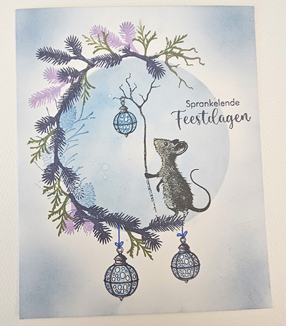 De kaart draagt de tekst “Sprankelende Feestdagen”, elegant geplaatst naast het muisje. Elk element is met zorg gestempeld en ingekleurd, waardoor de kaart warmte, fantasie en ambachtelijke charme uitstraalt.