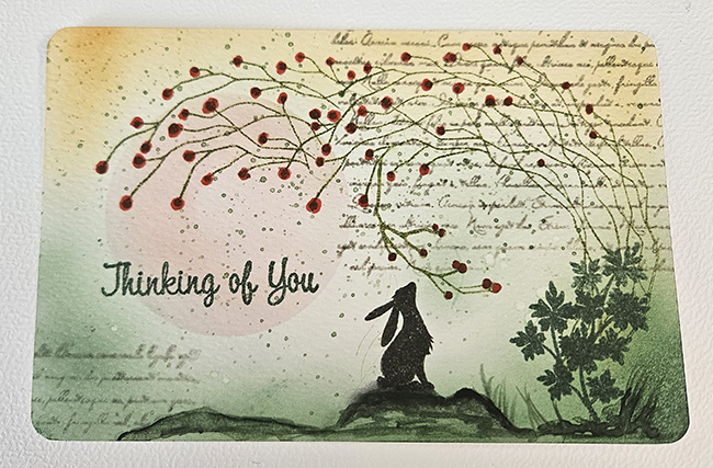 Deze handgemaakte wenskaart ademt zachte melancholie en warme aandacht. Centraal zit een klein konijntje stilletjes op een heuvel, alsof het luistert naar de wereld om zich heen. Boven hem buigt zich een sierlijke boog van fijne takjes vol rode bessen, elk met zorg aangebracht. Op de achtergrond vloeien groentinten, zachte perzikroze lichtcirkel en subtiele spetters in elkaar, wat de kaart een dromerig aquareleffect geeft. Achter het tafereel staan vervaagde, kalligrafische teksten die de sfeer van een gevonden brief uit vervlogen tijden oproepen.