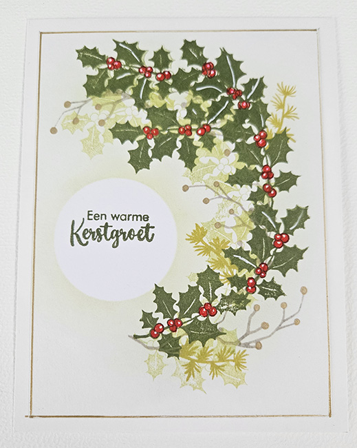 Deze handgemaakte kerstkaart straalt warmte, rust en tijdloze eenvoud uit. Een sierlijke krans van hulstbladeren, rode bessen en zachte wintertakken omringt de tekst “Een warme kerstgroet”. De natuurlijke groentinten en subtiele goudaccenten zorgen voor een klassieke, evenwichtige uitstraling die tegelijk verfijnd en hartelijk aanvoelt.