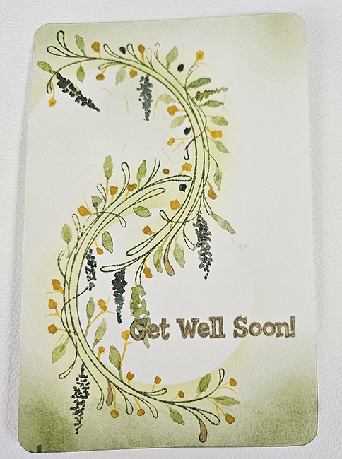 De achtergrond loopt zacht over in verschillende groentinten en roept een gevoel op van groei, ademruimte en hoop. Onderaan de kaart staat de tekst “Get Well Soon!” gedrukt in een elegante bronskleurige letter, die het geheel een verfijnde en verzorgde uitstraling geeft.
