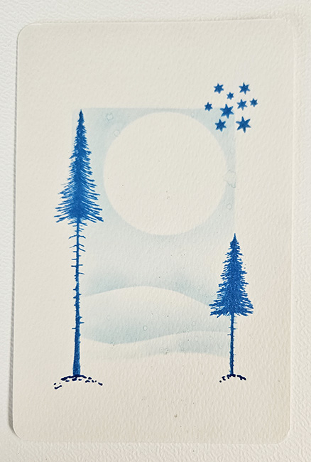 Deze handgemaakte blauwe kaartjes zijn ontstaan vanuit stilte, nacht en natuur. Maanlicht, dennenbomen, takken en kleine huisjes vormen samen een verstilde beeldtaal die rust en ruimte ademt. Elk ontwerp wordt met de hand gemaakt en straalt eenvoud, aandacht en zorg uit. De diepe blauwtinten nodigen uit tot vertragen en voelen zacht, beschermend en troostend aan.