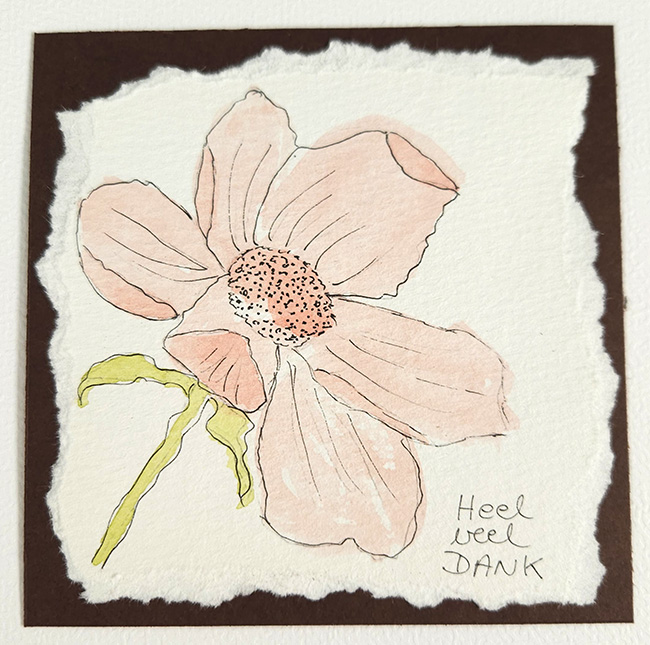 Een elegante, handgeschilderde aquarel wenskaart met een sierlijke roze bloem die subtiel straalt in haar eenvoud. Fijne inktlijnen benadrukken de zachte bloemblaadjes en het warme hart van de bloem. De handgeschreven tekst “Heel veel DANK” maakt dit kaartje tot een oprechte en stijlvolle manier om je dankbaarheid te tonen. Afgewerkt op handgeschept papier en stevig donkerbruin karton voor een natuurlijke, artistieke uitstraling.