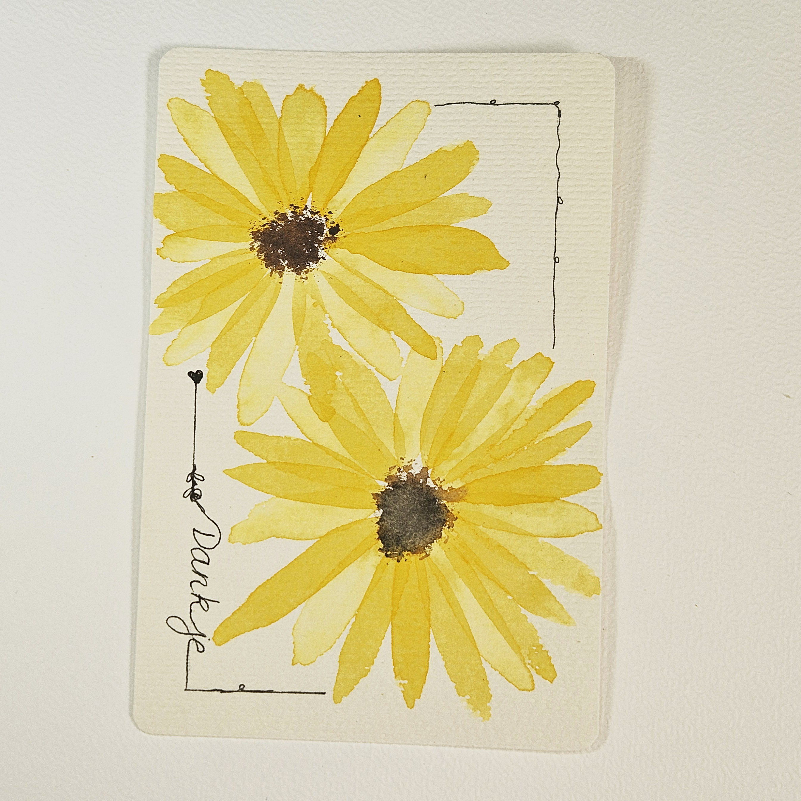 De aquareltechniek zorgt ervoor dat elke kaart uniek is, met subtiele variaties in kleur en textuur die het handgemaakte karakter benadrukken. Dit maakt de 'Zonnebloem Dank kaart' niet alleen een middel om je dankbaarheid te uiten, maar ook een klein kunstwerk dat de ontvanger kan koesteren.